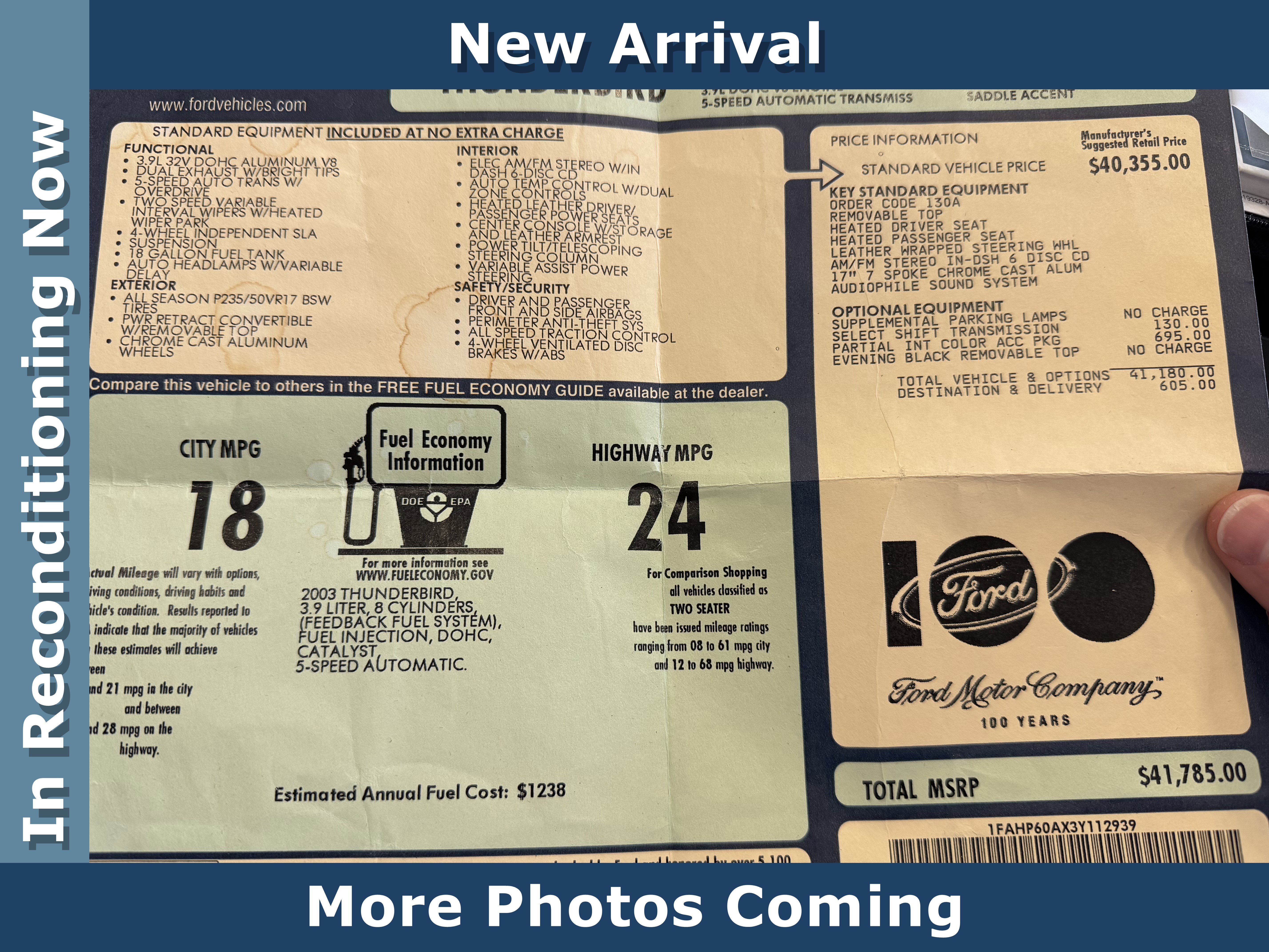 Davis Moore CDJR is proud to present this 2003 Ford Thunderbird . All of our Pre-Owned vehicles come with the exclusive Davis-Moore 360 Coverage. This coverage includes: two free oil changes, no charge check engine light diagnostic, 171-point comprehensive inspection quality guarantee with up to a 90 day or 4000 mile limited warranty and a 3 Day vehicle return policy. - See dealer or website for more detail. https://www.davis-moore.com/davis-moore-360-guarantee.html.